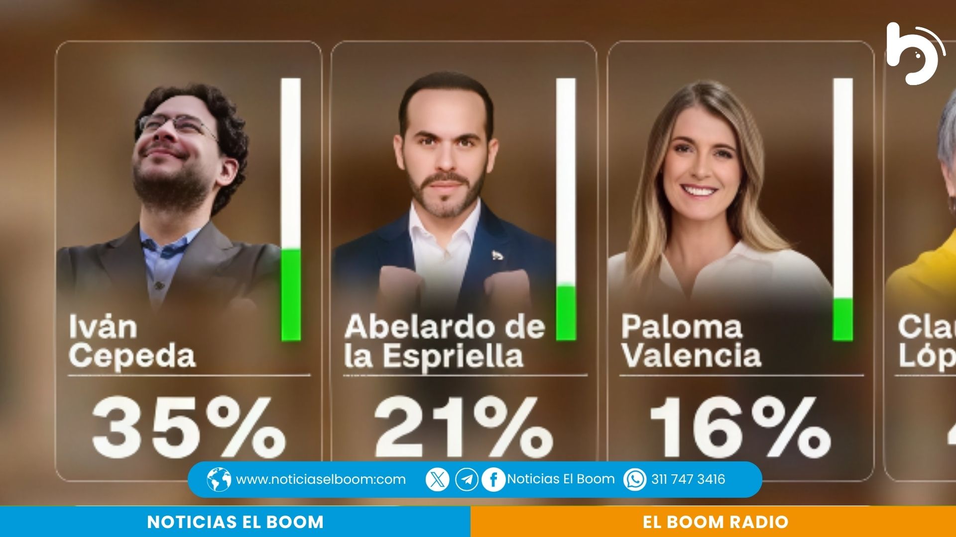 De acuerdo con los resultados, el Iván Cepeda obtendría el 35 % de la intención de voto, seguido por Abelardo de la Espriella con el 21 %, y Paloma Valencia con el 16 %.