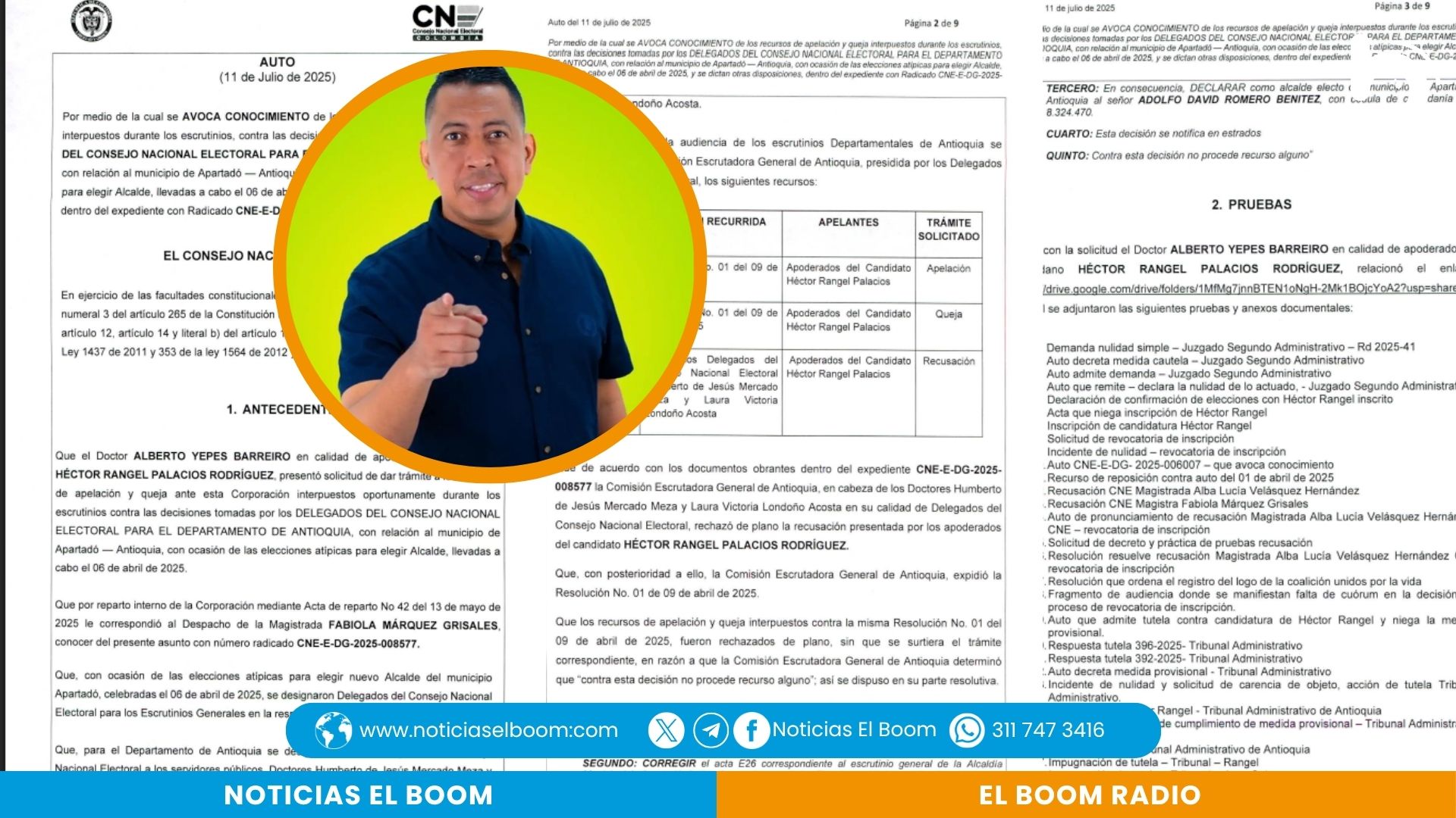 La magistrada ponente Fabiola Márquez Grisales, mediante Auto del 11 de julio de 2025 (radicado CNE-E-DG-2025-008577), ordenó a la Registraduría Especial de Apartadó entregar todo el paquete electoral original: actas, formularios E-14, escrutinios y demás documentos que servirán para determinar si hubo o no manipulación en el resultado final.