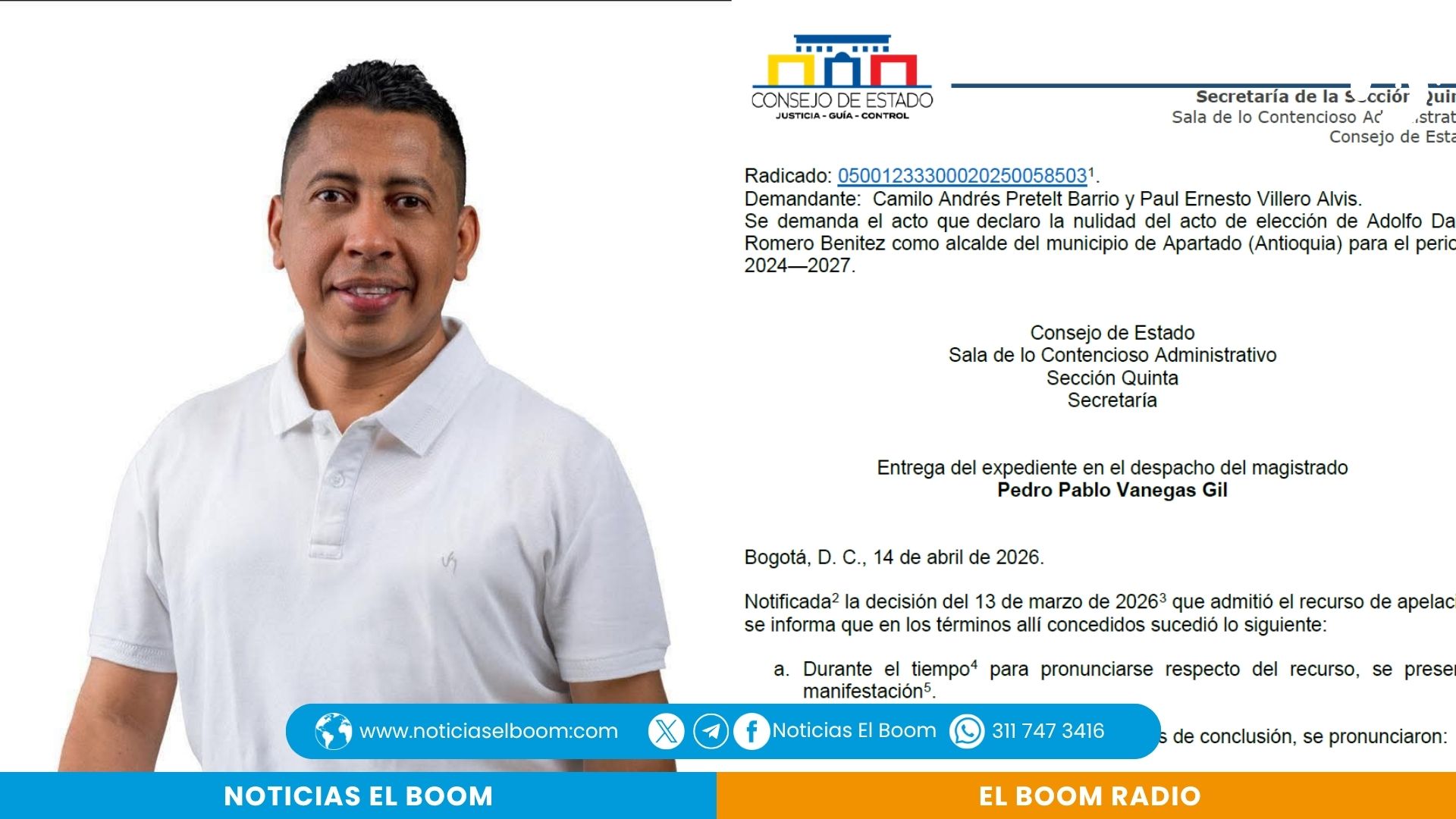 El Consejo de Estado dejó en manos del magistrado ponente el expediente que definirá el futuro jurídico del alcalde de Apartadó, Adolfo David Romero Benítez, al quedar listo para sentencia tras surtirse las etapas procesales.