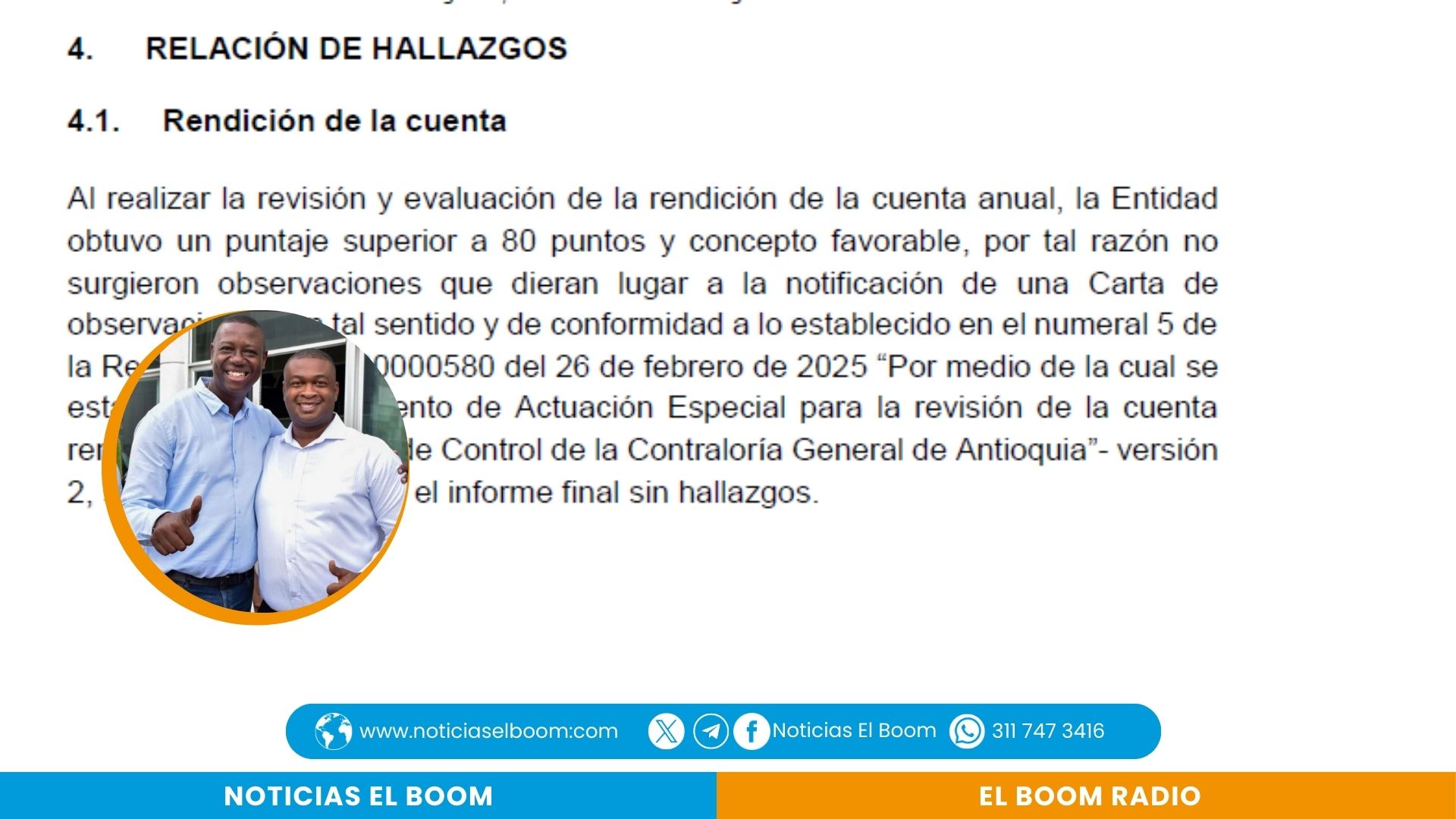 La Empresa para el Desarrollo Urbano y Hábitat (EDUHA) salió bien librada de la auditoría realizada por la Contraloría General de Antioquia a la vigencia 2024. El informe final entregado el 8 de septiembre de 2025 concluyó que la entidad cumplió con los criterios de oportunidad, suficiencia y calidad en la rendición de cuentas, obteniendo un puntaje de 90,6 sobre 100, sin que se detectaran hallazgos fiscales ni irregularidades en el manejo de los recursos.2025100008482