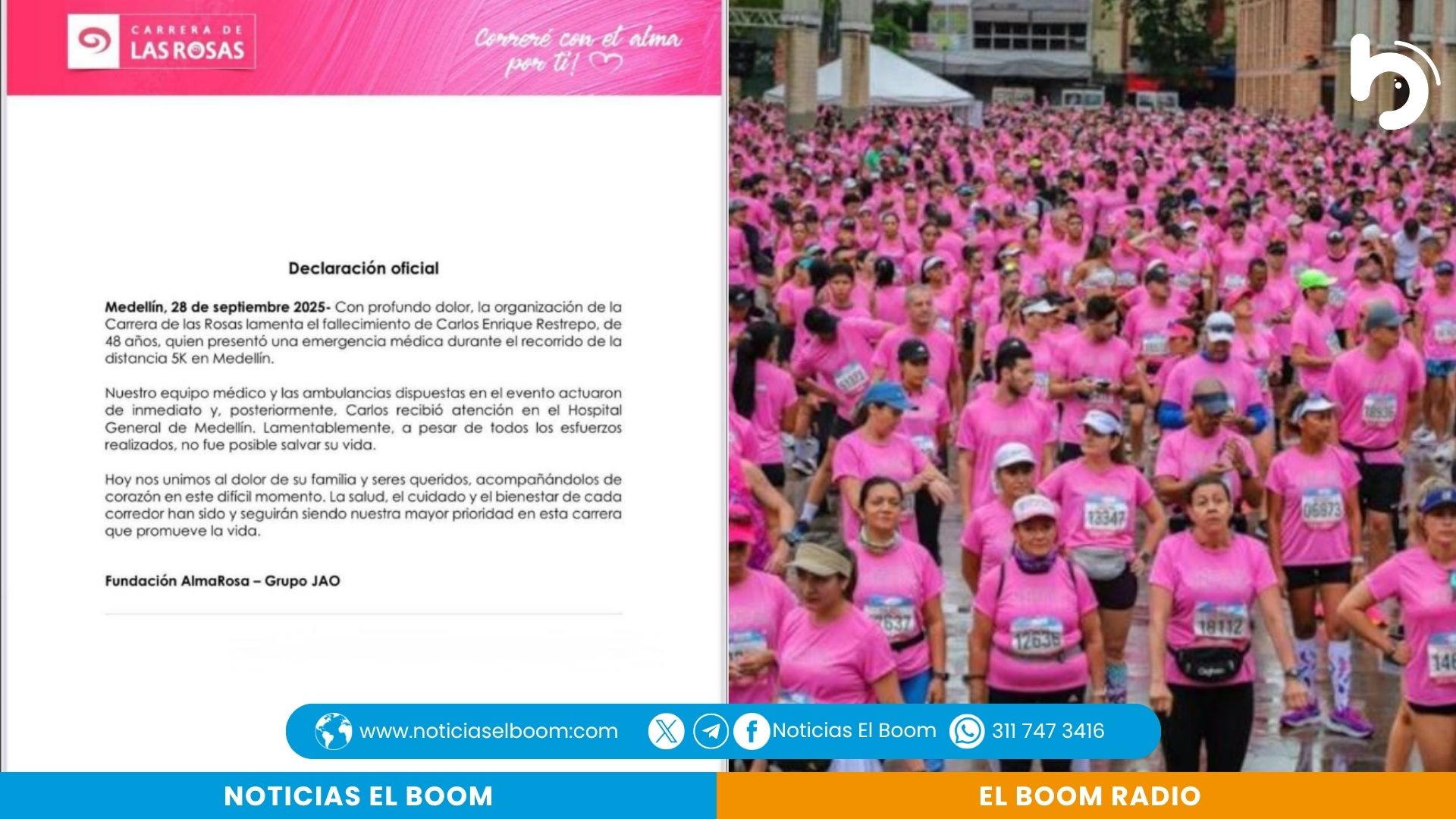 La noticia fue confirmada por la Fundación AlmaRosa y el Grupo JAO, organizadores de la carrera, quienes expresaron su profundo pesar por lo ocurrido. A través de sus redes sociales, lamentaron la pérdida y enviaron un mensaje de condolencia a la familia de Carlos Enrique, reiterando que la salud, el bienestar y la seguridad de los participantes siempre han sido una prioridad para la organización.