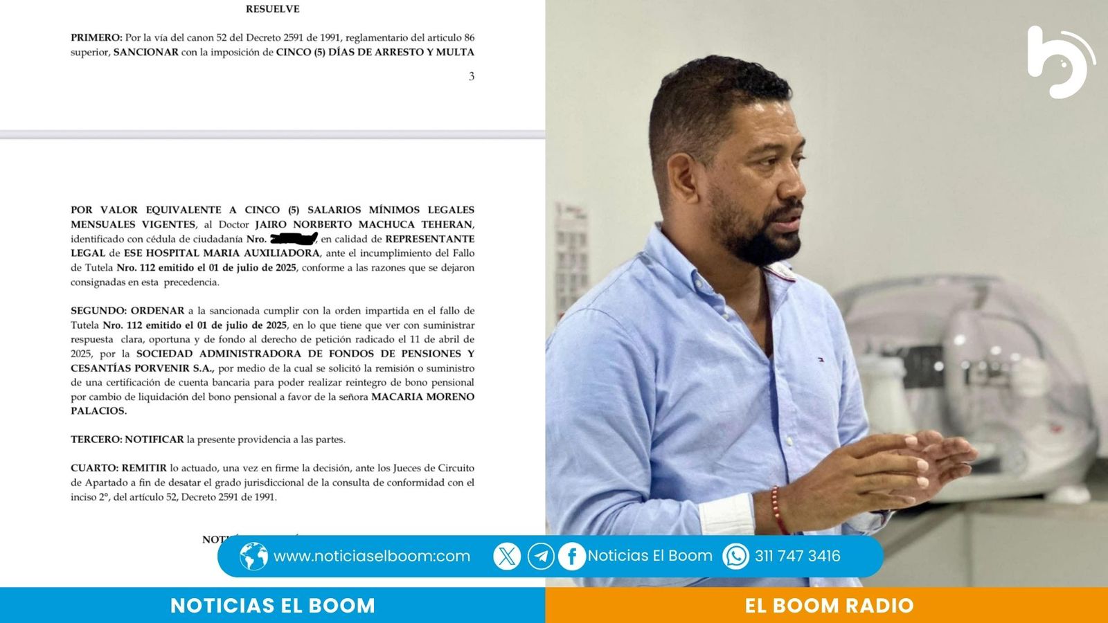El Juzgado Segundo Promiscuo Municipal de Chigorodó sancionó con cinco días de arresto y una multa equivalente a cinco salarios mínimos legales mensuales vigentes al Dr. Jairo Norberto Machuca Teherán, gerente del ESE Hospital María Auxiliadora, por desacatar una orden judicial.