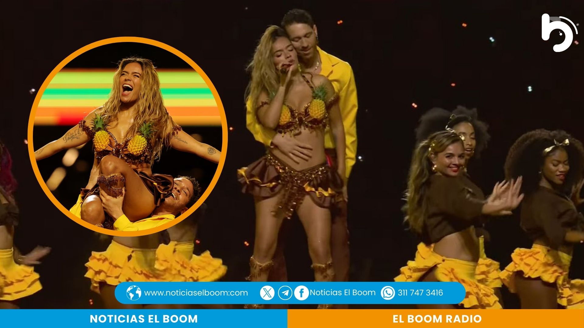 Su aparición también dio de qué hablar por el vestuario: un top con dos piñas de diseño realista acompañado de tirantes coloridos, un atuendo que combinó con la esencia tropical de su espectáculo y que generó gran repercusión en redes sociales.