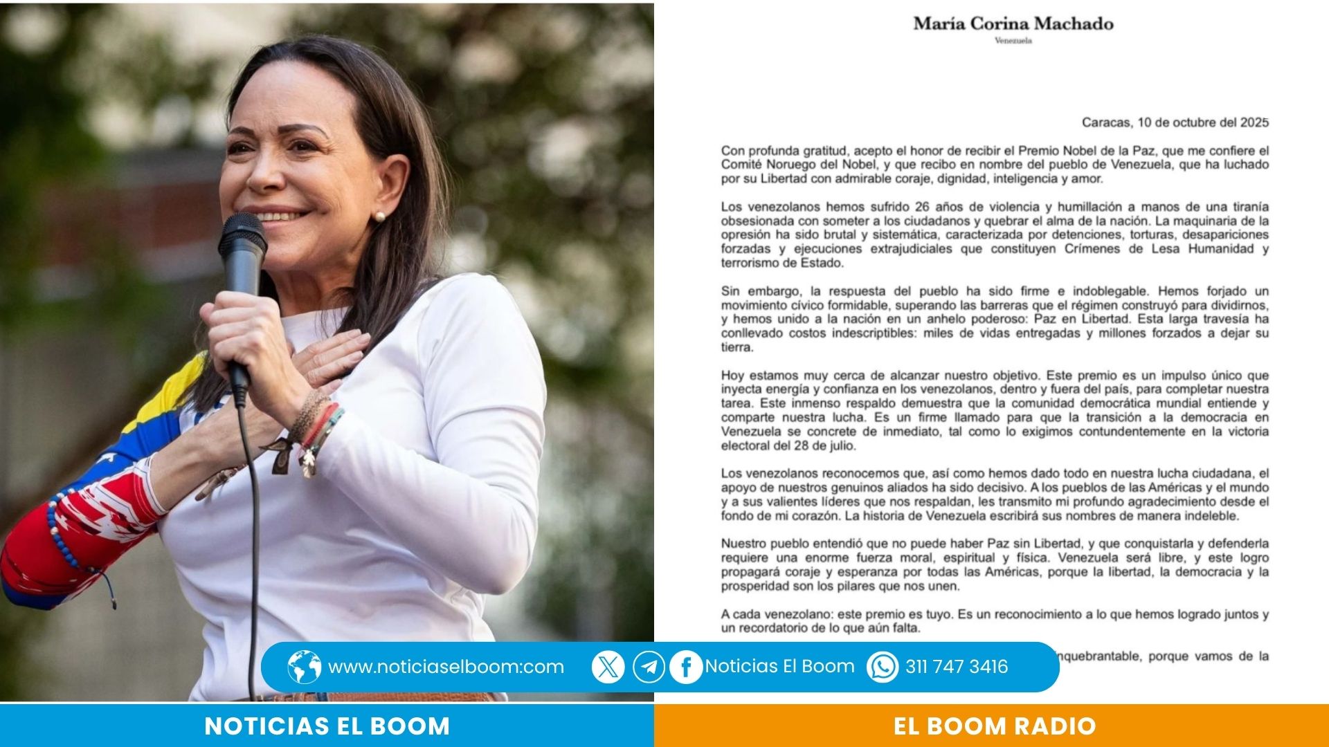La líder opositora venezolana María Corina Machado expresó su gratitud tras recibir el Premio Nobel de la Paz 2025, reconocimiento que, según afirmó, pertenece al pueblo de Venezuela “por su admirable coraje, dignidad, inteligencia y amor en la lucha por la libertad”.