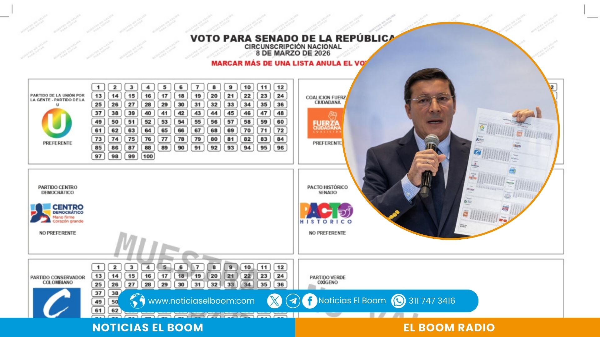 La Registraduría Nacional dio a conocer la disposición oficial del tarjetón para las elecciones al Senado de la República de 2026, en el que 16 listas políticas competirán por las curules el próximo 8 de marzo.